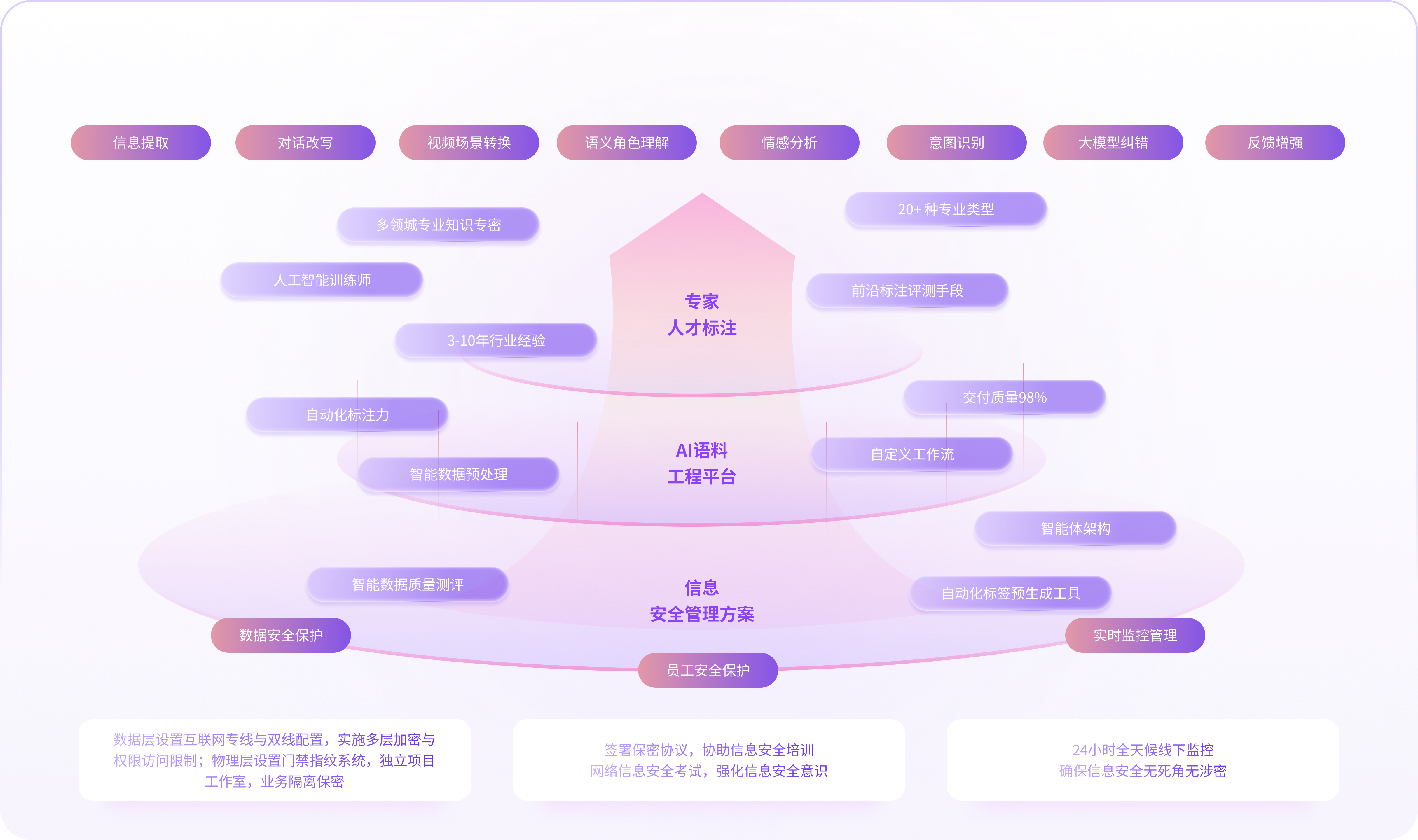 数据层设置互联网专线与双线配置,实施多层加密与权限访问限制;物理层设置门禁指纹系统,独立项目工作室,业务隔离保密